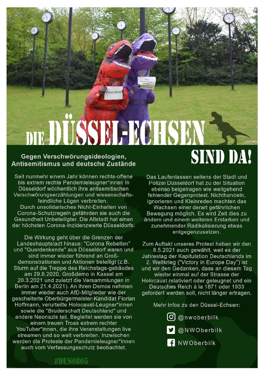 Die Veranstaltung soll am 8. Mai um 14 Uhr am Mannesmannufer Ecke Thomasstraße stattfinden. Nähere Informationen finden sich unter twitter.com/NWOberbilk und #dus0805.