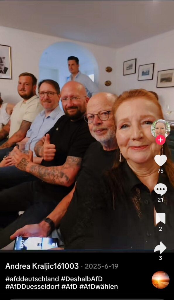 Weitere Aufnahmen zeigen Gustavsohn inmitten der Düsseldorfer AfD-Politiker*innen Marco Vogt, Dr. Uwe Bresztowszky, Andrea Kraljic und Dennis Busch bei einem Vortragsabend mit dem rheinland-pfälzischen Landtagsabgeordneten Joachim Paul am 19. Juni 2025 im Dortmunder Wahlkreisbüro des Bundestagsabgeordneten Matthias Helferich.